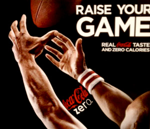 The guy in the pic is catching a football, but in his catching arms, there is a Coke-a-Cola Bottle. Also, the O in the word Zero on the bottle looks more like a Q.