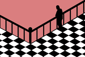 I see the man’s backside, but is he leaning on a huge platform or matress? Or is he looking down into a deep abyss?